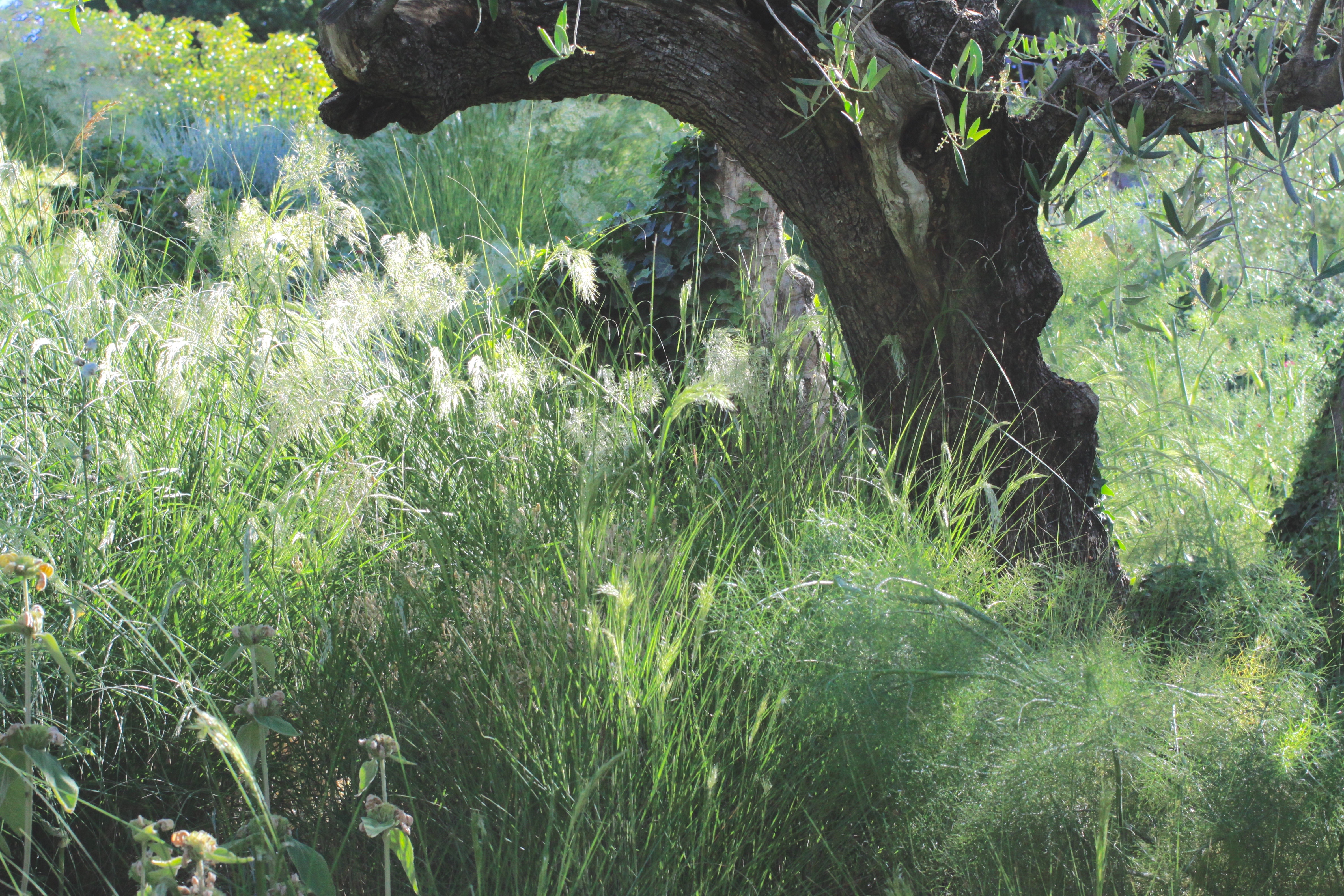 A completely dry garden, with steep terraces, thickets of native plants at the bottom of the garden helps absorb the run off of the rainwater from the upper part of the garden. A very steep rockery behind the house has been planted to add colour and interest on entering the property.